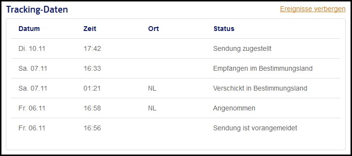 - Tracking codes sind erst verfügbar 3 bis 4 Tage nach dem Versand der mail zur Lieferung.