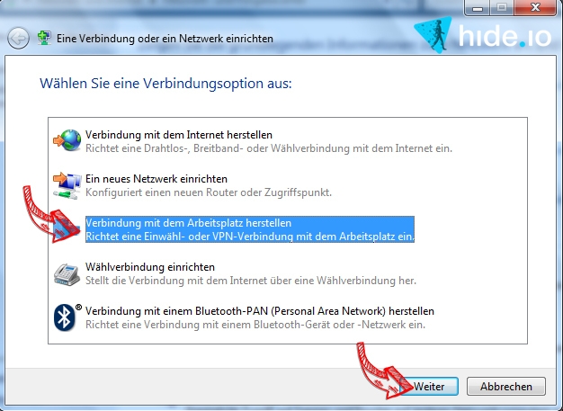 Schritt 3: Wähle „Verbindung mit dem Arbeitsplatz herstellen“ aus und klicke auf „Weiter“.