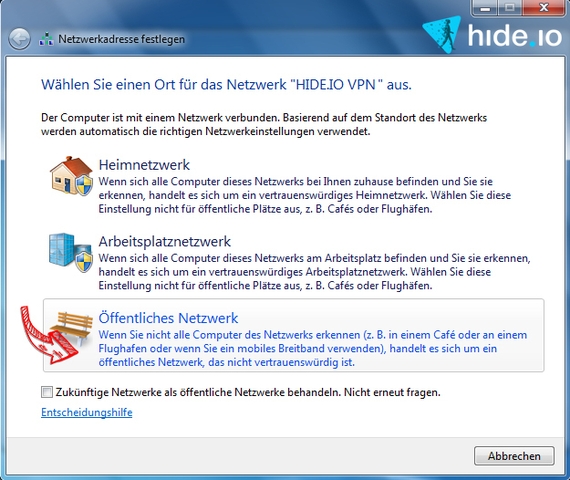 Schritt 8: Sobald die Netzwerkadresse festgelegt werden soll, wähle „Öffentliches Netzwerk“ aus.