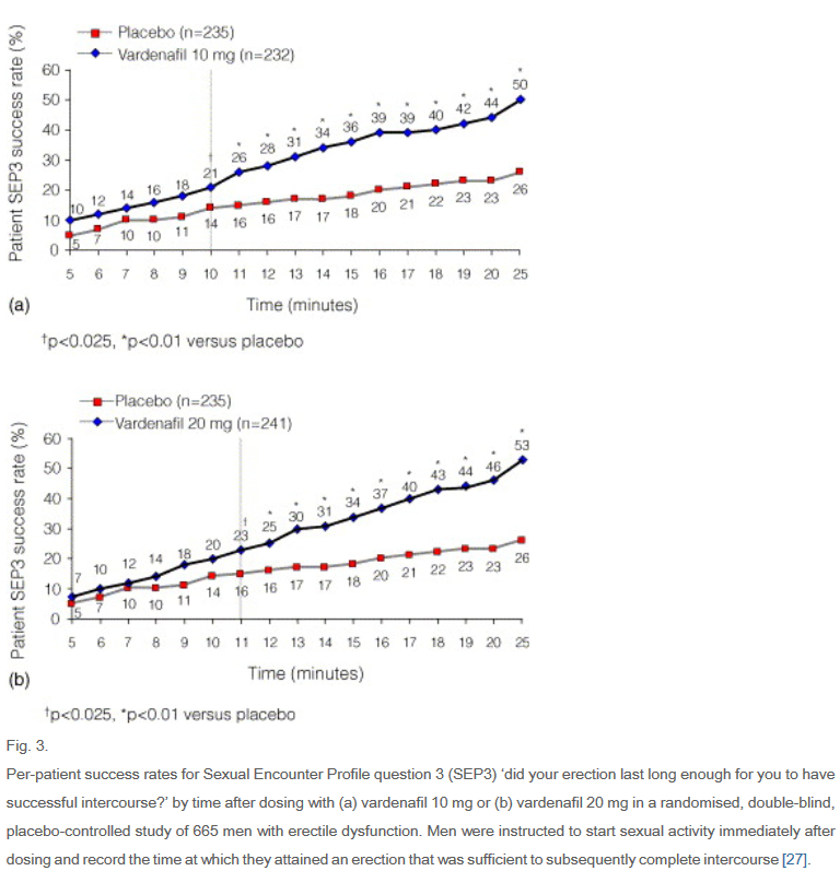 Und man sieht im Diagramm, dass bereits bei ca. 10 Minuten nach Einnahme ein signifikanter Unterschied in der Wirkung gegenüber der Placebogruppe festgestellt werden kann.