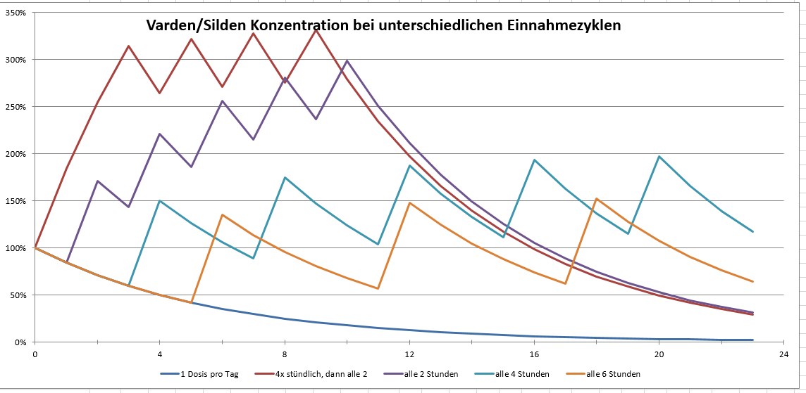 Ich habe meine Club-Dosierung Dosierung stündlich 4x 60mg Varden, und ab dann alle 2 Stunden Nachwurf von 60mg Varden mal in die Excel-Datei von Alex2307 eingetragen. Dabei habe ich eine Halbwertszeit von 4 Stunden angenommen, somit passt das auch für Silden... und dabei erstaunliche Erkenntnisse gewonnen... seht selbst: