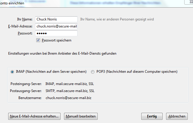 Hat jemand Erfahrungen damit, wie man eine E-Mail-Adresse von beispielsweise Secure-Mail.biz unter Thunderbird lauffähig bekommt?