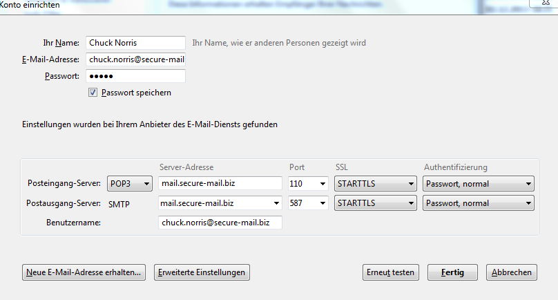 POP3: mail.secure-mail.biz, Port: 110, STARTTLS, Password: normal