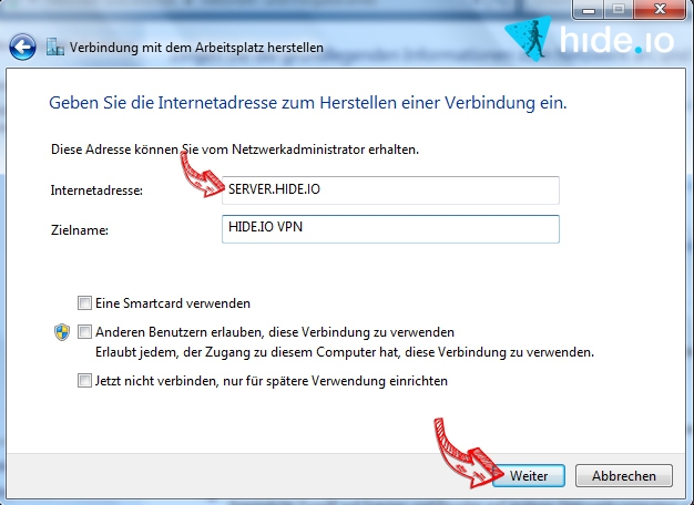 Schritt 5: Trage bei Internetadresse ein zB nl.hide.io und als Zielname eine Bezeichnung deiner Wahl. Klicke danach auf „Weiter“.